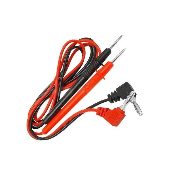 Przewody pomiarowe w kolorze czarnym i czerwonym z jednej strony zakończone są sondami pomiarowymi o długości 110mm, z drugiej kątowymi wtykami bananowymi z końcówkami bez osłon. Przewody pomiarowe dedykowane są do uniwersalnego miernika DT9205, 830.