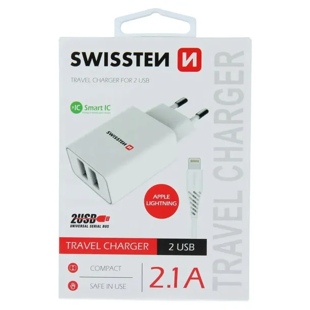 Swissten SMART IC posiada 2 porty USB i prąd wyjściowy 2,1A. Dzięki temu możesz łatwo ładować dwa urządzenia jednocześnie. Dzięki SMART IC ponadto optymalnie rozprowadza prąd wyjściowy z każdego ładowanego urządzenia. Opakowanie zawiera kabel do transmisji danych USB / LIGHTNING o długości 1,2 m. Kolor biały.